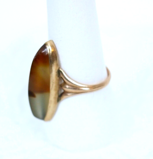 30's Antique 10k Rose Gold Long Banded Agate Miller-Steinau Navette Ring