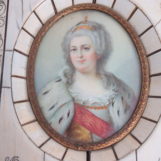 19th c. Hand-Painted Catherine the Great Miniature Portrait – Bone Frame